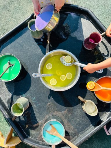 We are having so much fun this summer term and have been getting up to lots of water activities to help cool us down. We have had lots of new water trays set up with colour mixing, different fruits and lots of pouring and potion making.